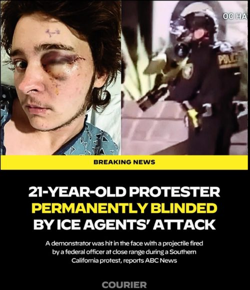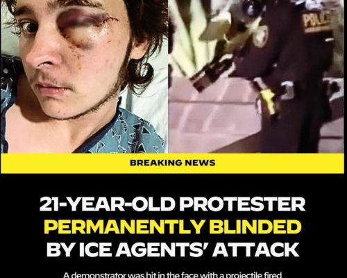 A deeply troubling image is circulating online, showing the aftermath of a protest that ended in life-altering consequences for a young demonstrator. According to reports, a 21-year-old protester was permanently blinded after being struck in the face during a confrontation involving ICE agents — a moment that has reignited national debate over crowd control, force, and accountability.